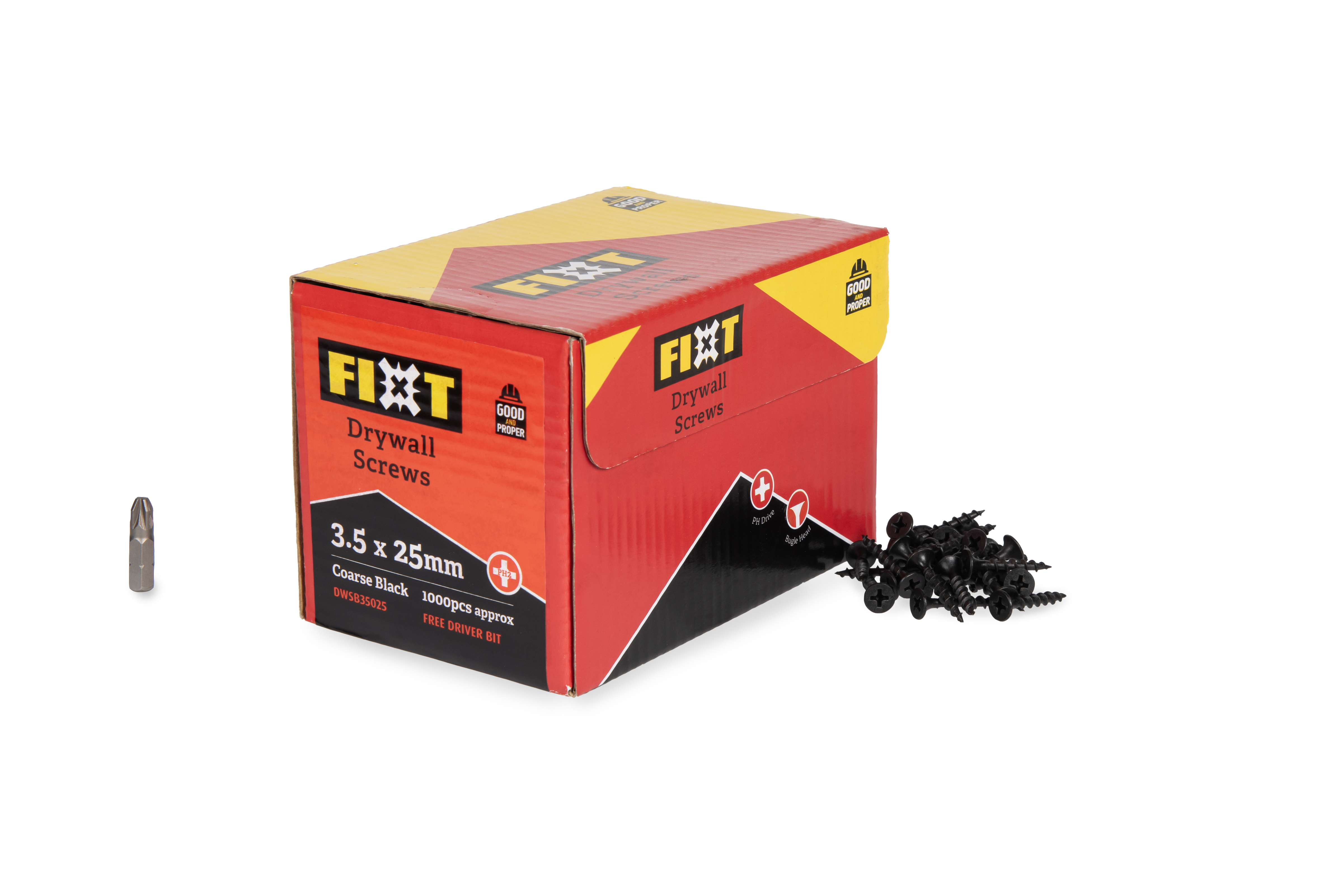 FIXT Drywall Screws are a premium quality plasterboard screw. Our Drywall Screws are engineered to make every DIY job stronger, easier, and longer lasting. Designed with an ultra-sharp point to instantly penetrate the board, a bugle head to prevent surface damage and ensure a flush finish but also a deep PH2 drive recess. FIXT Drywall Screws are available with a coarse thread and a black phosphate coating to fix plasterboard to timber. Finished with high quality coatings to prevent corrosion and recess clogging, they are available in a wide range of sizes and pack quantities. All our FIXT Drywall Screws offer the same consistency of quality and performance.