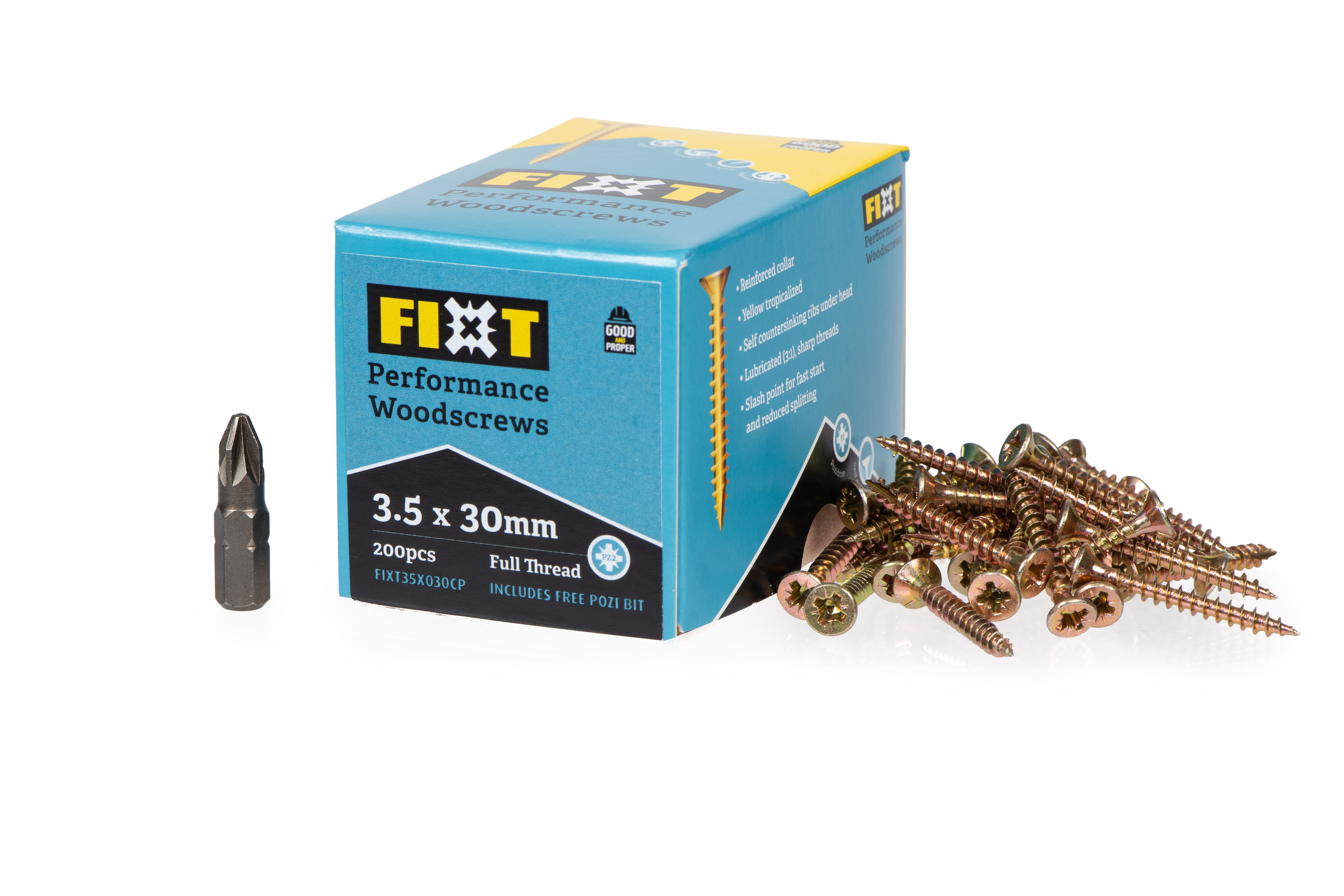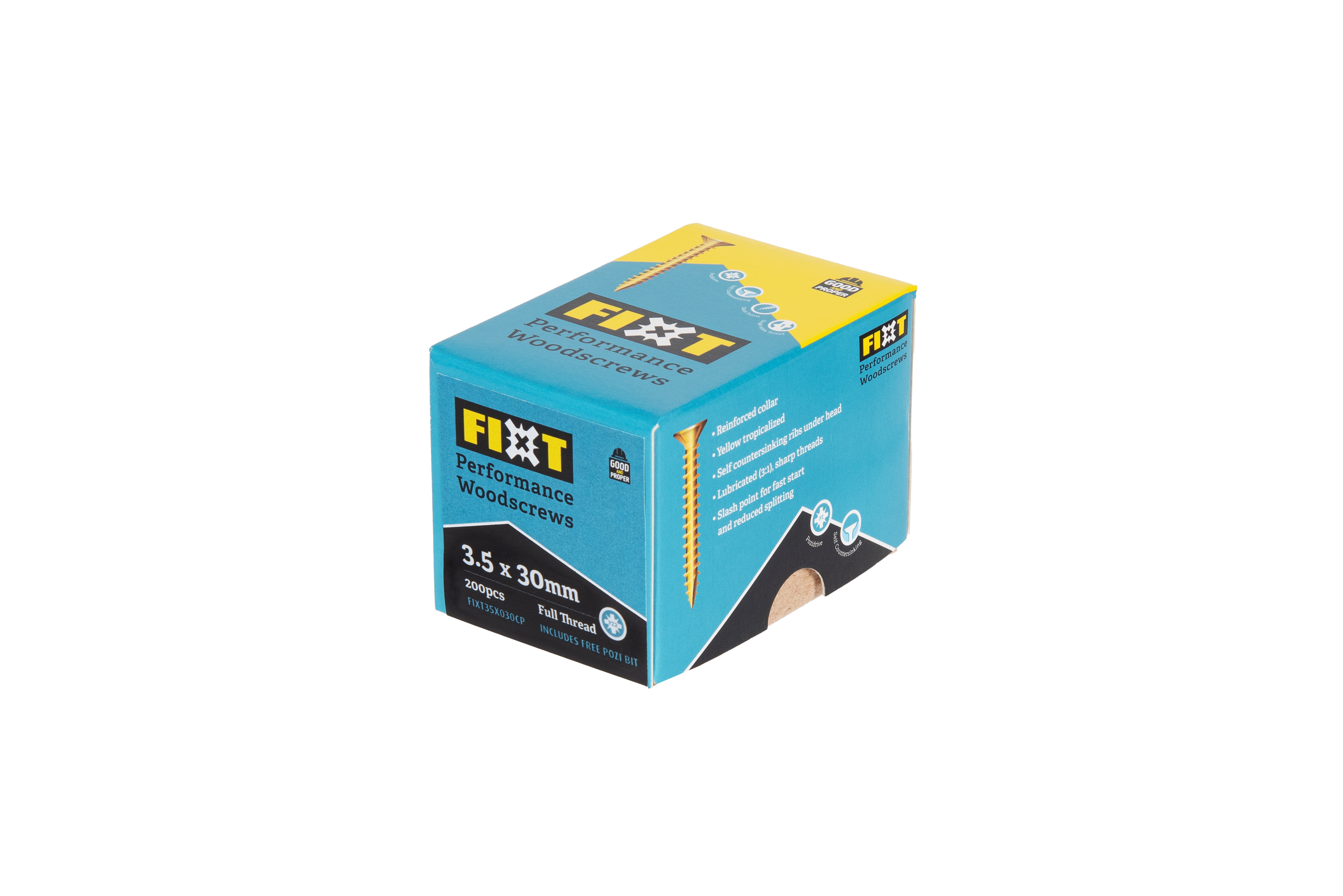 FIXT Performance Woodscrews are engineered to make every DIY job stronger, easier, and longer lasting. Designed with a recessed double countersunk head for extra strength and break resistance, these screws drive smoothly and hold with exceptional power. The wide single thread cuts cleanly into wood, gripping and compressing the fibres for outstanding pull-out resistance. Whatever you build stays solid. A Yellow Tropicalised coating gives superior corrosion protection, while the reinforced drive recess ensures a firm bit fit with less slipping and faster installation. Fully CE/UKCA certified, FIXT gives you professional grade performance at a DIY friendly price, making it the reliable choice for indoor and outdoor projects alike.