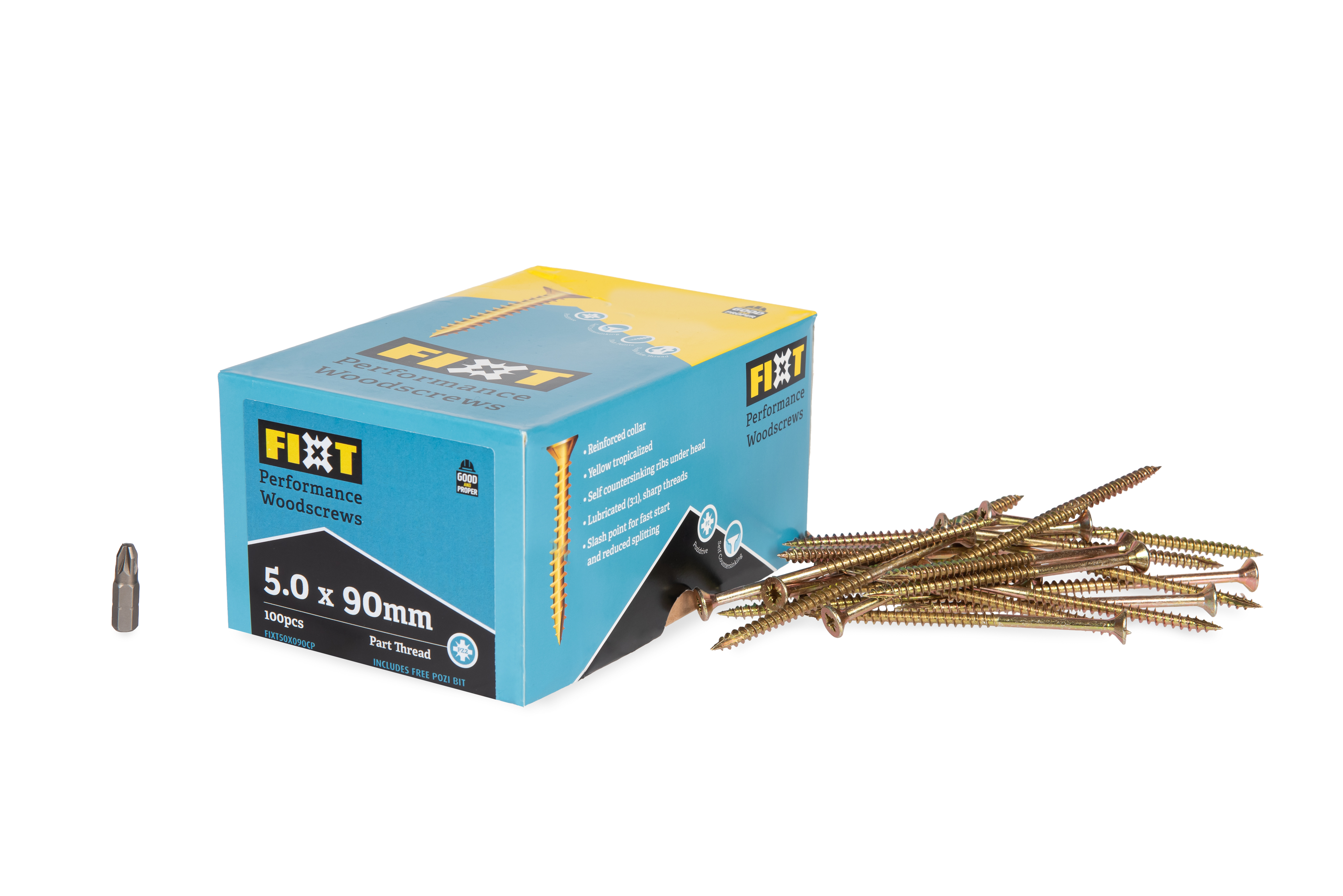 FIXT Performance Woodscrews are engineered to make every DIY job stronger, easier, and longer lasting. Designed with a recessed double countersunk head for extra strength and break resistance, these screws drive smoothly and hold with exceptional power. The wide single thread cuts cleanly into wood, gripping and compressing the fibres for outstanding pull-out resistance. Whatever you build stays solid. A Yellow Tropicalised coating gives superior corrosion protection, while the reinforced drive recess ensures a firm bit fit with less slipping and faster installation. Fully CE/UKCA certified, FIXT gives you professional grade performance at a DIY friendly price, making it the reliable choice for indoor and outdoor projects alike.